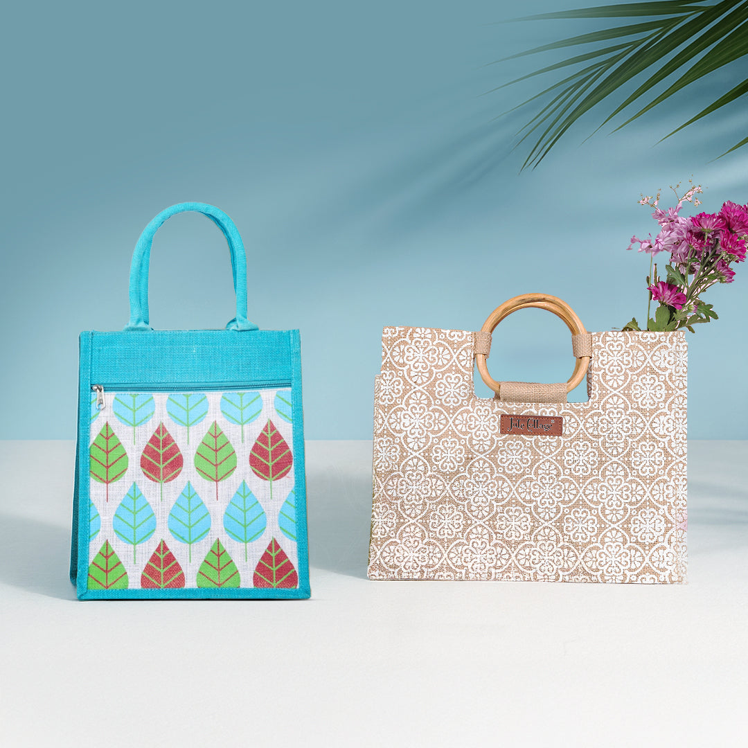 JUTE COTTAGE GEOMETRIC MOTIF PRINT LUNCH ZIPPER, SUSTAINABLE, ECO-FRIENDLY, 100% GENUINE JUTE, STYLISH (GREEN/RED 12X12X7)