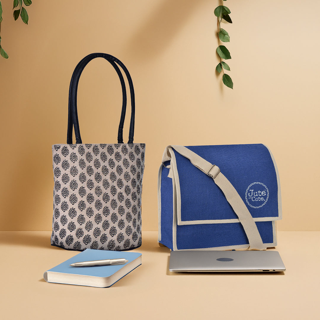 Combo of Jute Navy Blue Warli Lunch Bag and Navy Blue Warli Bottle Bag