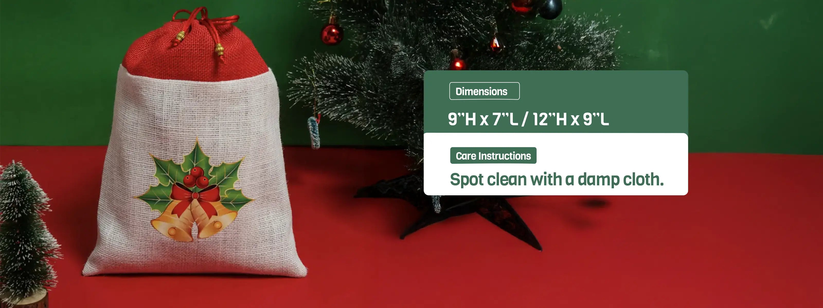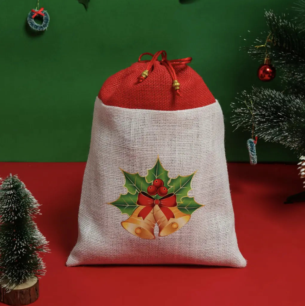 Eco-friendly, stylish, and festive, this jute pouch is your go-to for gifting, carrying essentials, and celebrating Christmas responsibly. Comes in 2 different sizes- 12"H x 9"W and 9"H x 7"W.