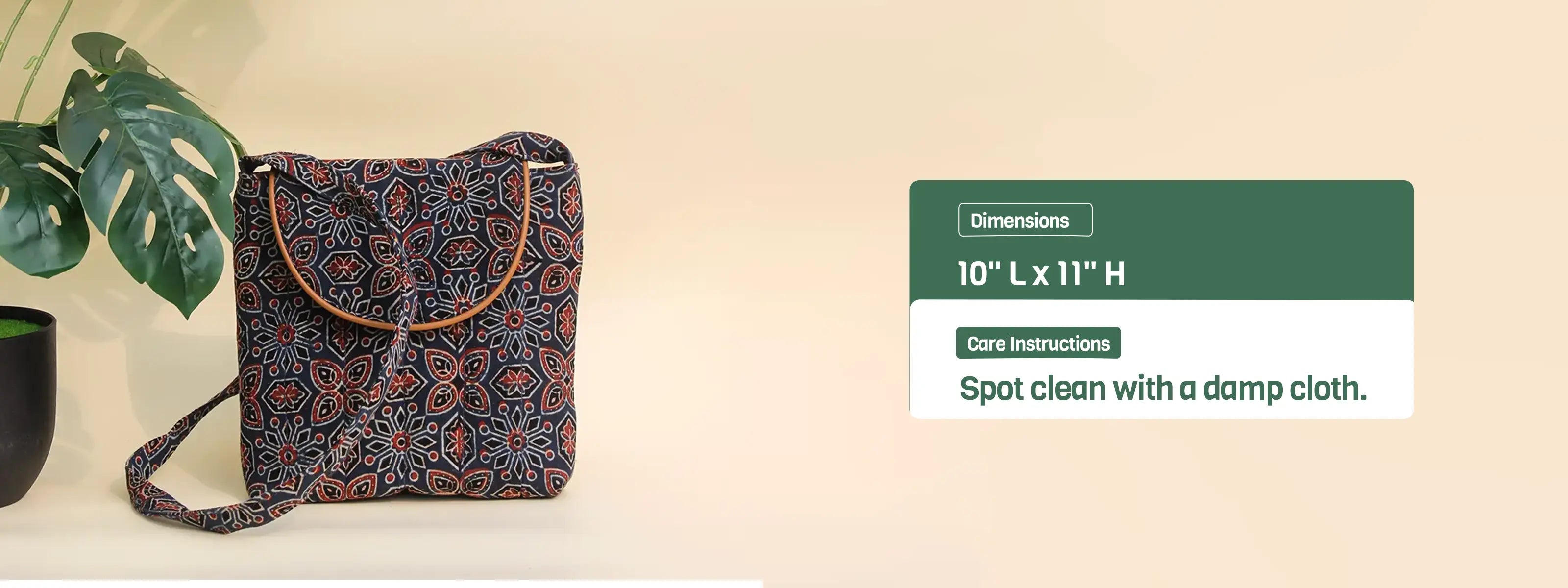 A versatile 10”x11" ajrakh sling bag crafted in cotton Ajrakh fabric. Lightweight yet spacious, perfect for everyday use with a touch of artisanal flair.