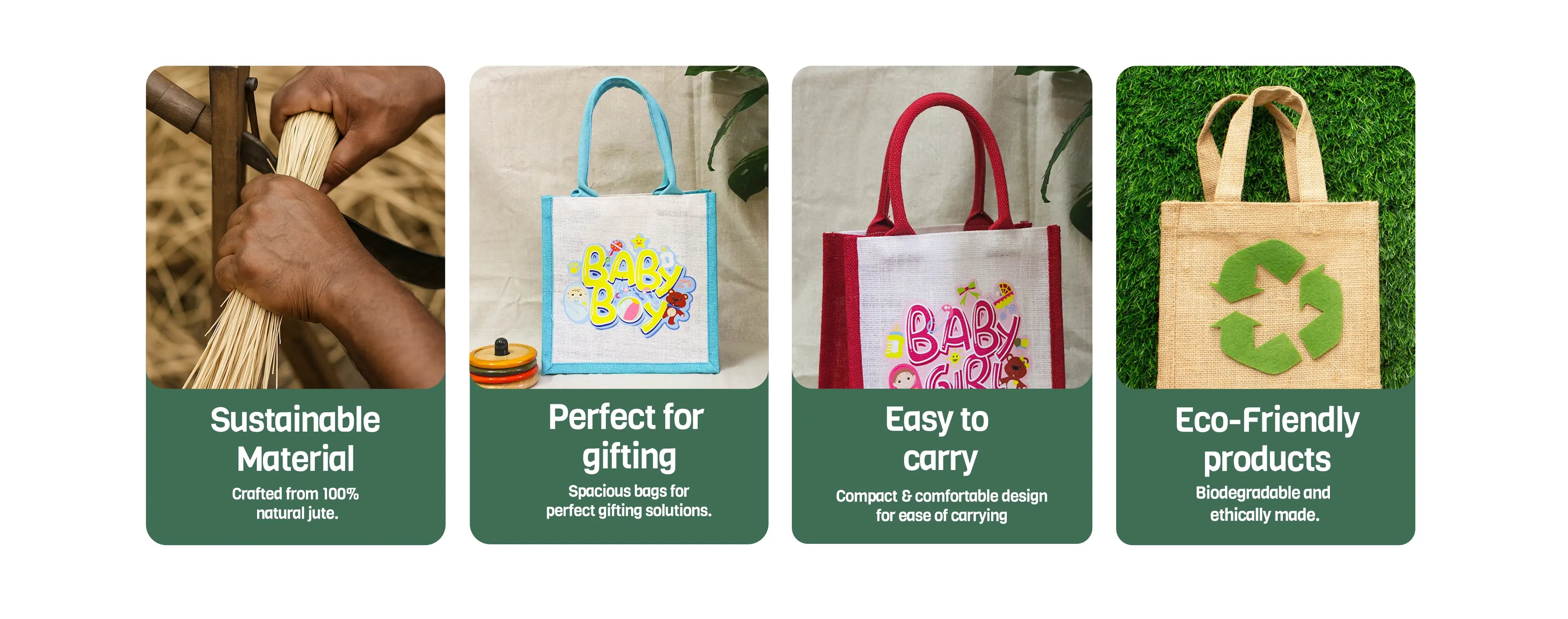 Eco-friendly, stylish, and proudly Made in India—Jute Cottage bags replace over 1000 plastic bags and support a greener planet. Our bags are Jute Mark Certified 100% Genuine Jute, 100% biodegradable and compostable and are durable, lightweight, and versatile.