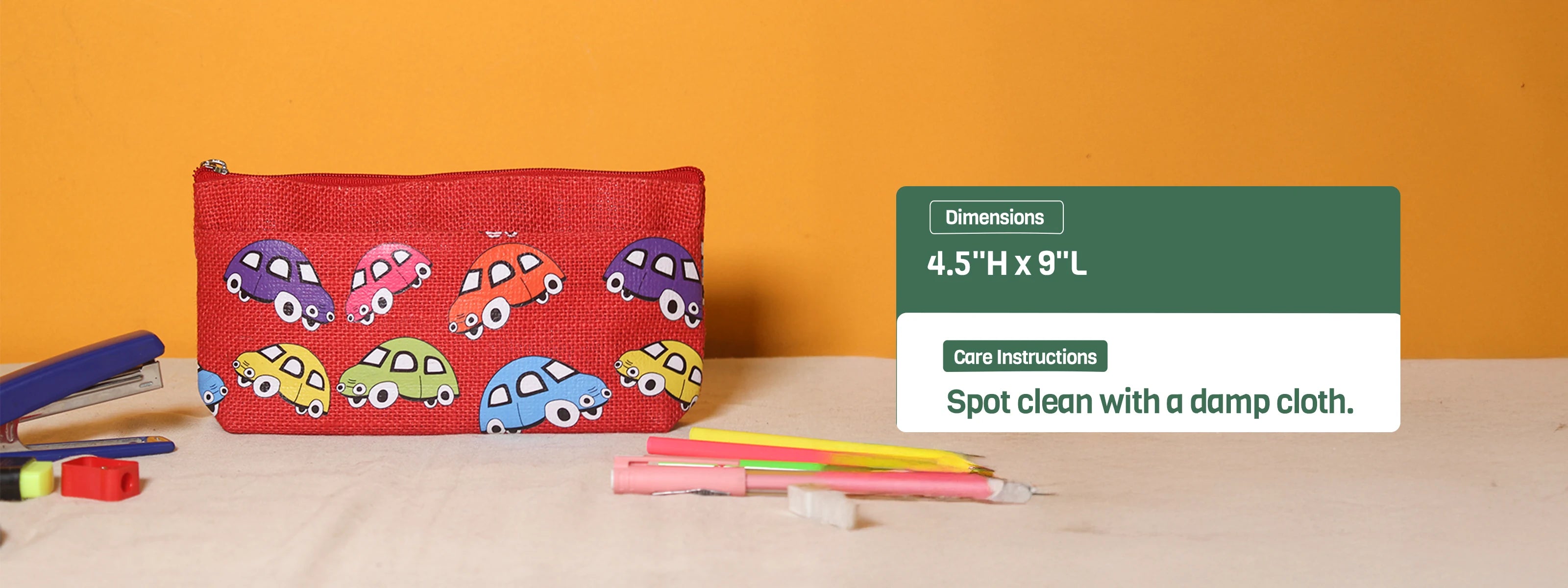 An eco-friendly jute pencil pouch(4.5"H x 9"W) with a car print and a front pocket, perfect for kids to carry their everyday stationery in style.
