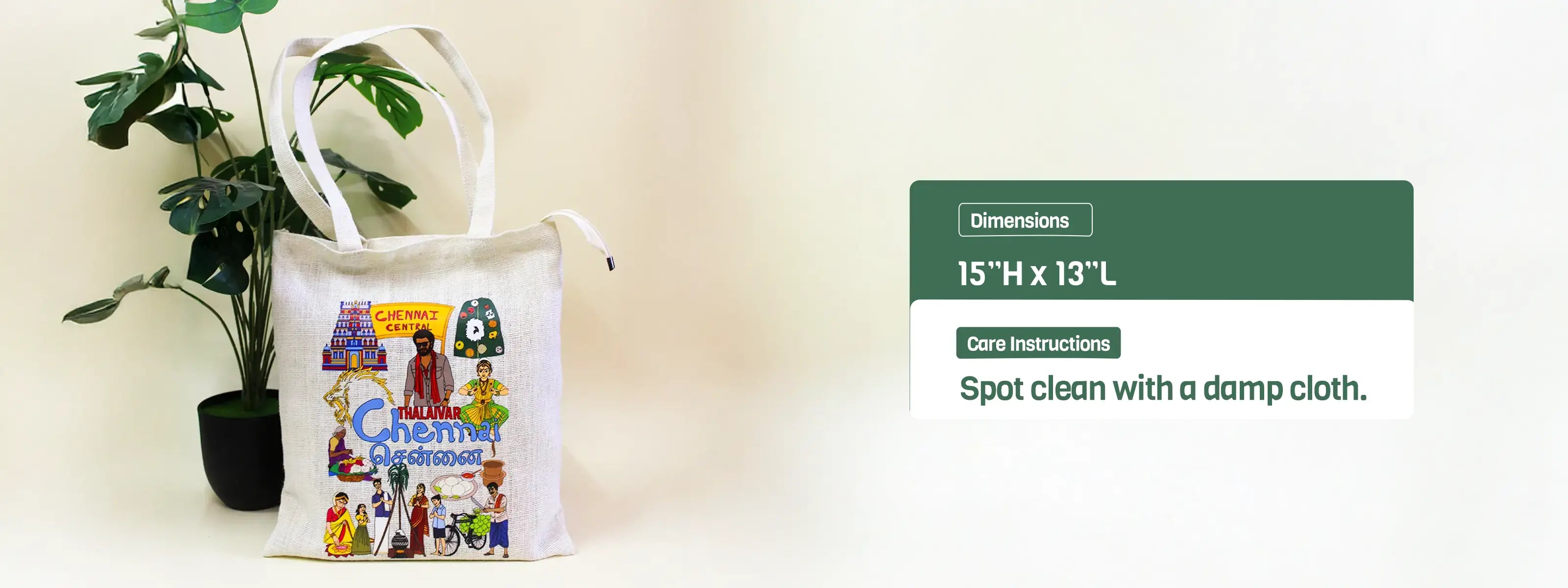 Jute tote which captures the essence of the city of Chennai to your everyday life with a zipper closure and an inner pocket.(15"H x 13"W)