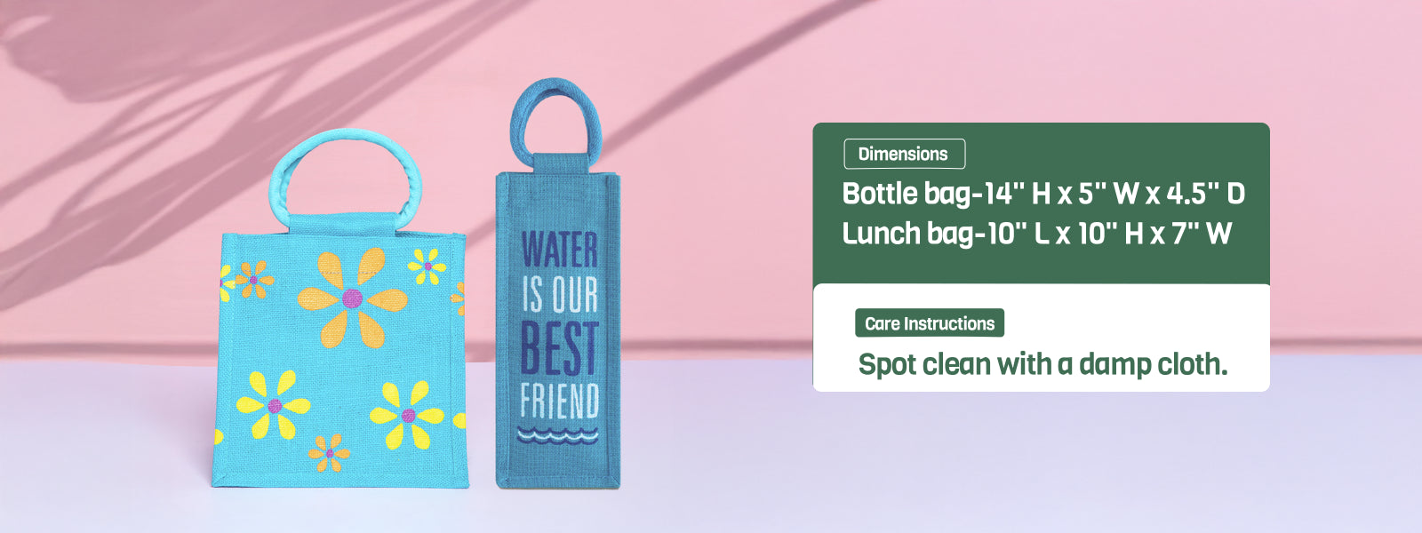 A vibrant duo featuring the multiflower jute lunch bag and the “Water is our best friend” printed bottle bag. A cheerful, eco-conscious combo perfect for everyday carry.