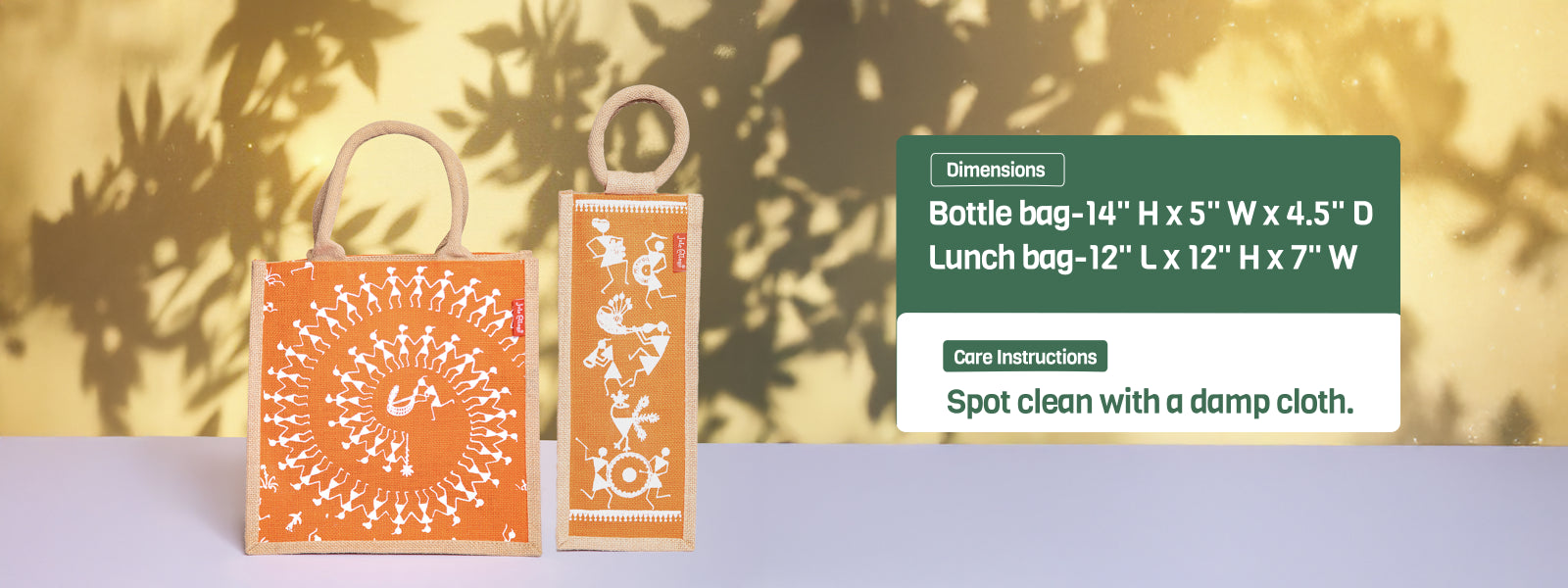 A coordinated set featuring the orange Warli print jute lunch bag and matching bottle bag. Traditional design meets everyday functionality in this eco-friendly and vibrant duo.