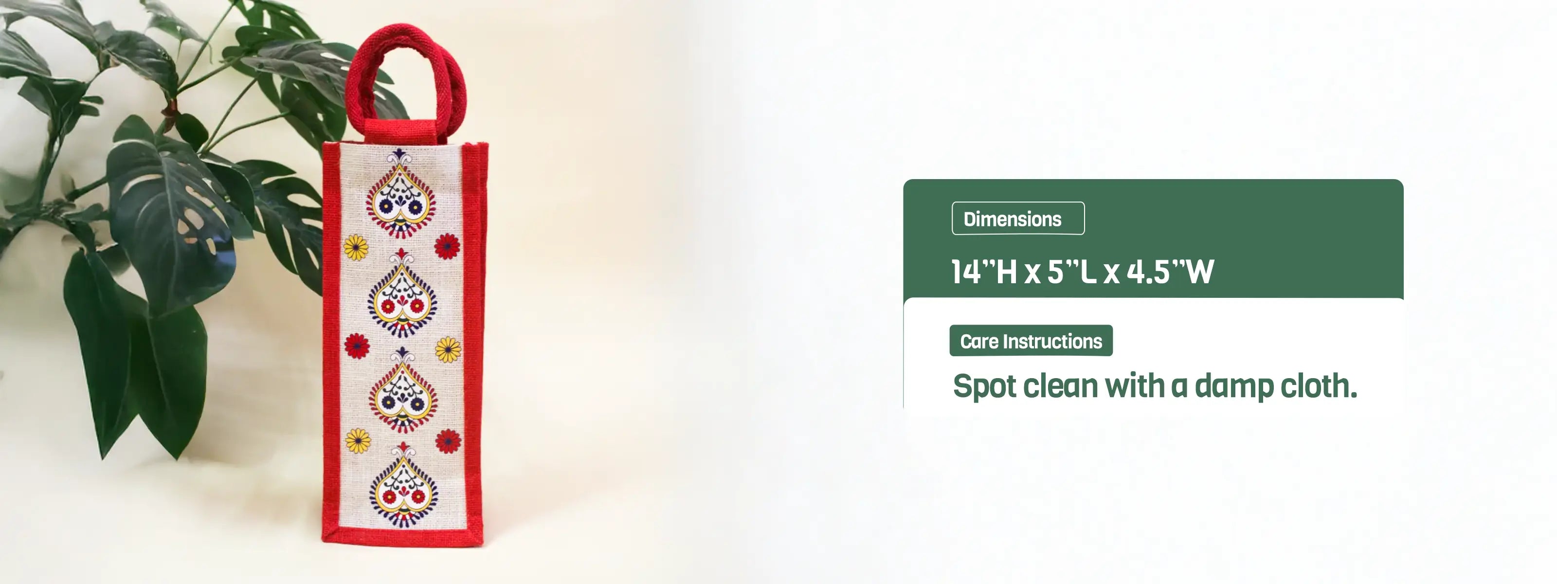 Our Desi Flower bottle bag(14"H x 5"L x 4.5"W) inspired by the beautiful Indian Buti Motifs is here for easy carrying of your bottle on a daily basis and sustainable gifting.