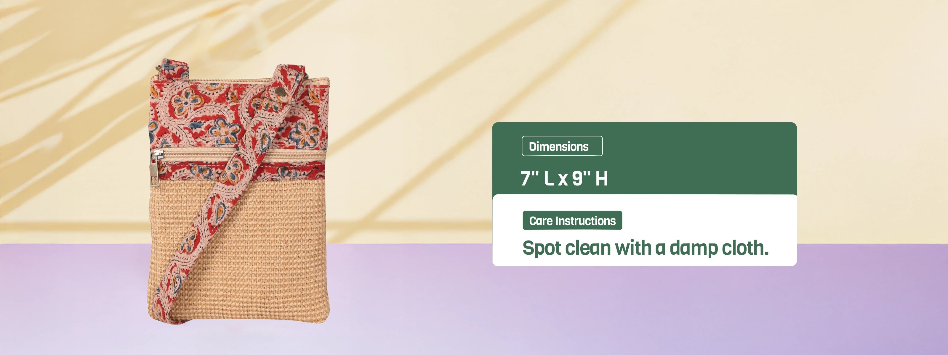 A compact and eco-friendly sling bag(9"H x 7"W) made from premium dobby jute with a soft cotton lining. Features 4 zippered compartments and a comfortable cotton sling strap for everyday use.