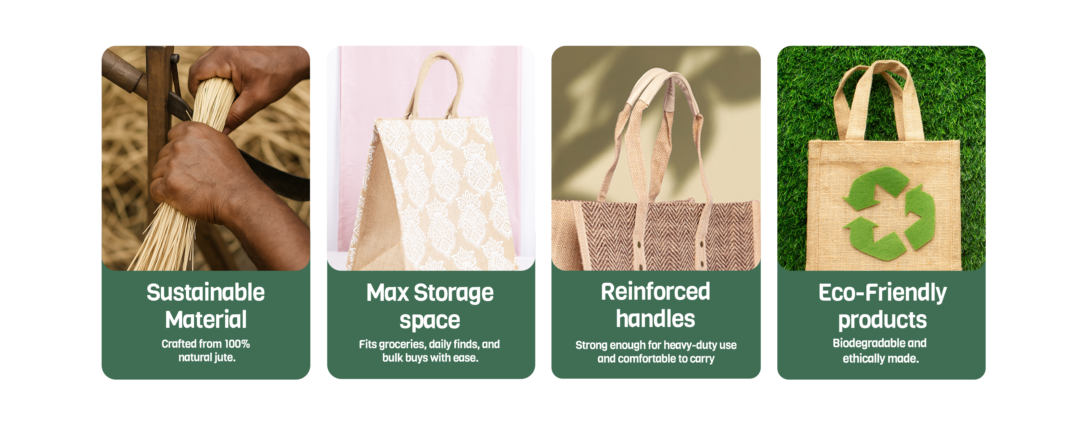 Eco-friendly, stylish, and proudly Made in India—Jute Cottage bags replace over 1000 plastic bags and support a greener planet. Our bags are Jute Mark Certified 100% Genuine Jute, 100% biodegradable and compostable and are durable, lightweight, and versatile.