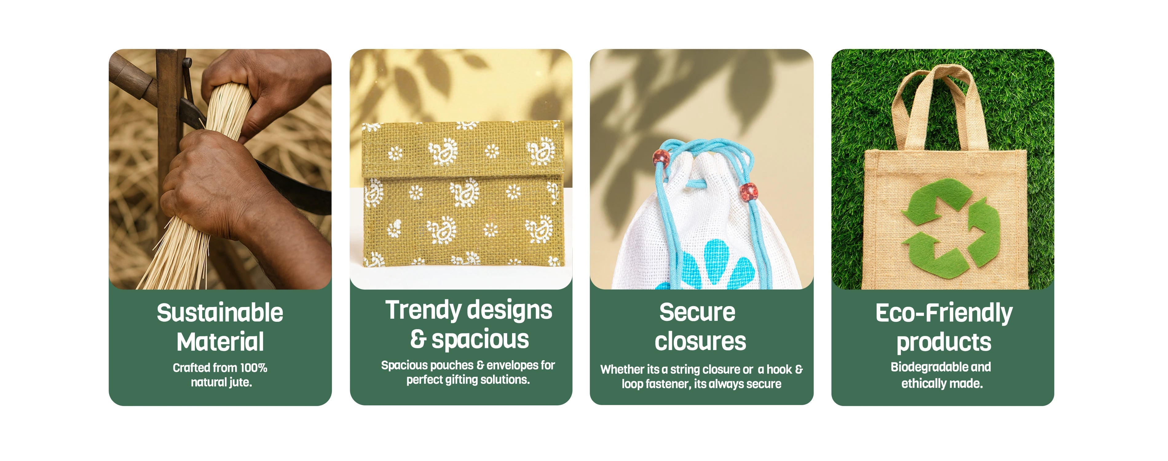 Eco-friendly, stylish, and proudly Made in India—Jute Cottage bags replace over 1000 plastic bags and support a greener planet. Our bags are Jute Mark Certified 100% Genuine Jute, 100% biodegradable and compostable and are durable, lightweight, and versatile.