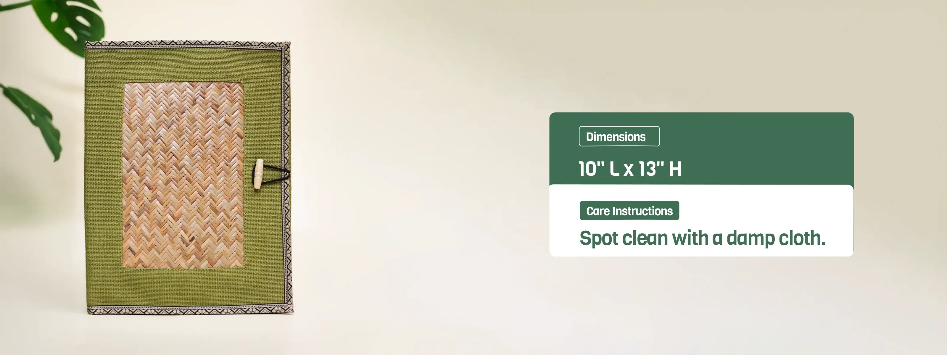 Crafted in jute and cane, this 10”L x 13”H folder comes finished with an elegant bead-and-loop closure.