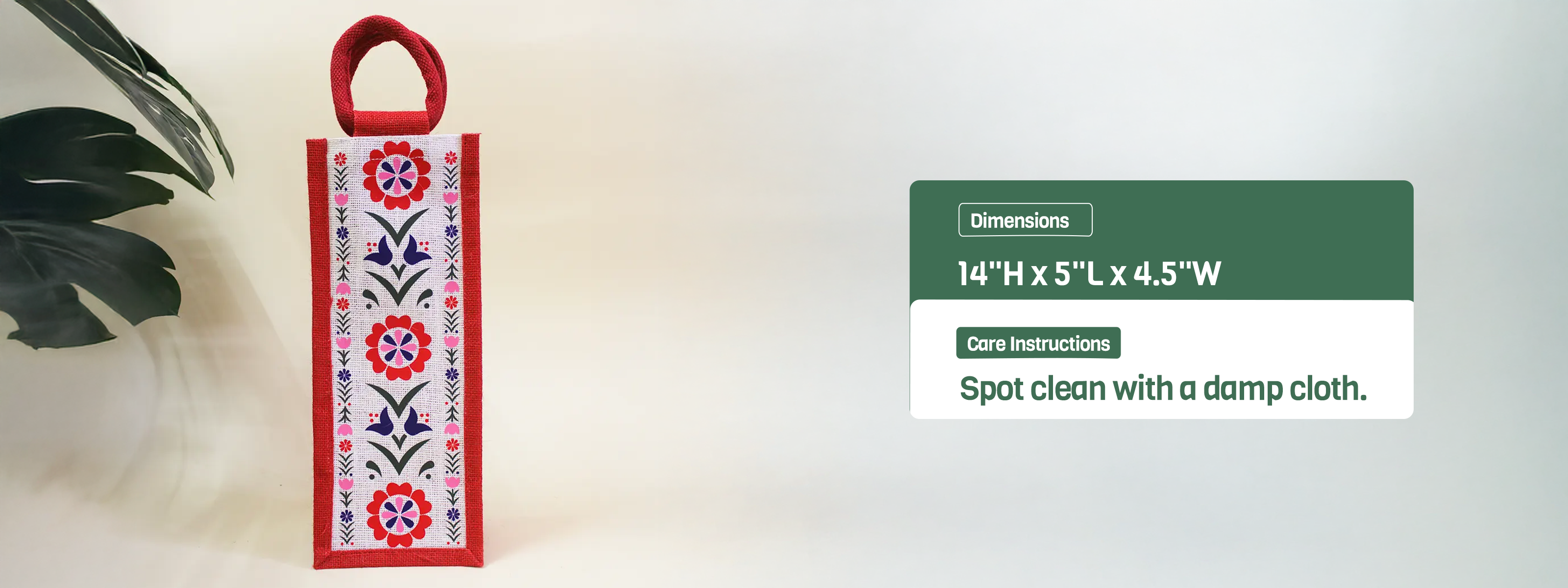 Our Geometric Floral bottle bag(14"H x 5"L x 4.5"W) inspired by geometrical motifs is here for easy carrying of your bottle on a daily basis and sustainable gifting