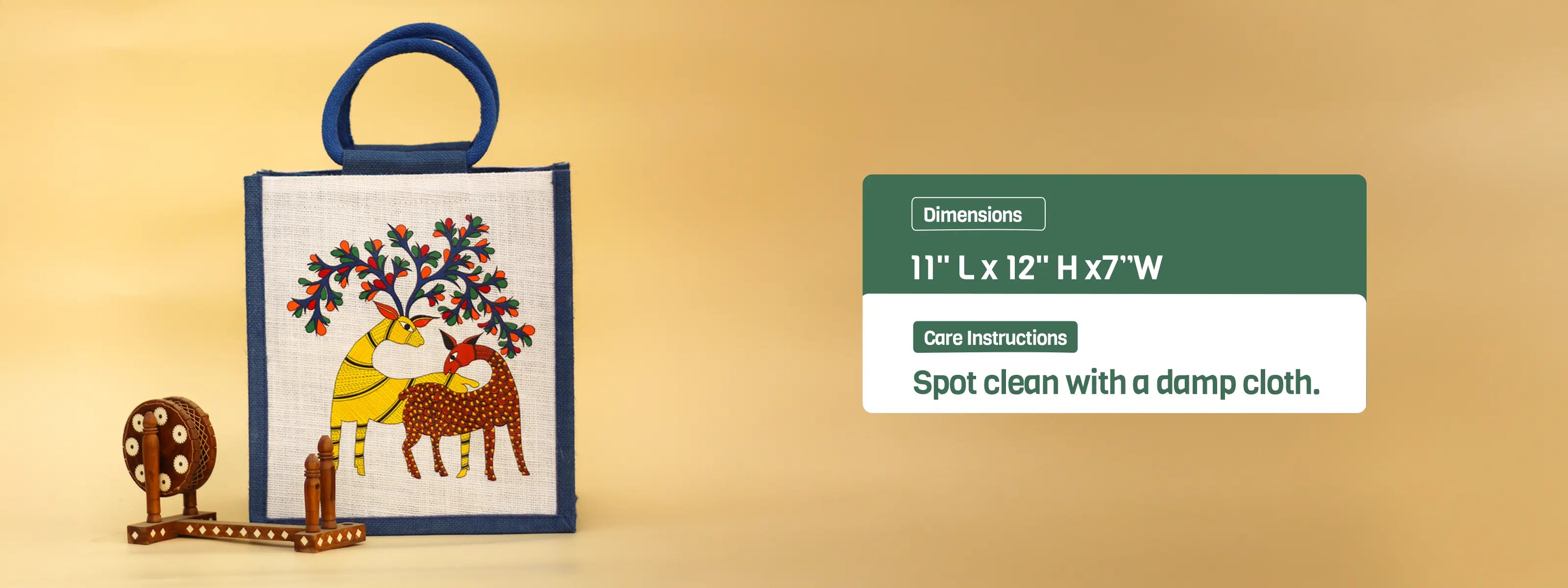 Inspired by the vibrant strokes of Gond art, this deer-printed lunch bag(12"Hx 11"L x7"W) brings a touch of Indian folk charm to everyday routines.