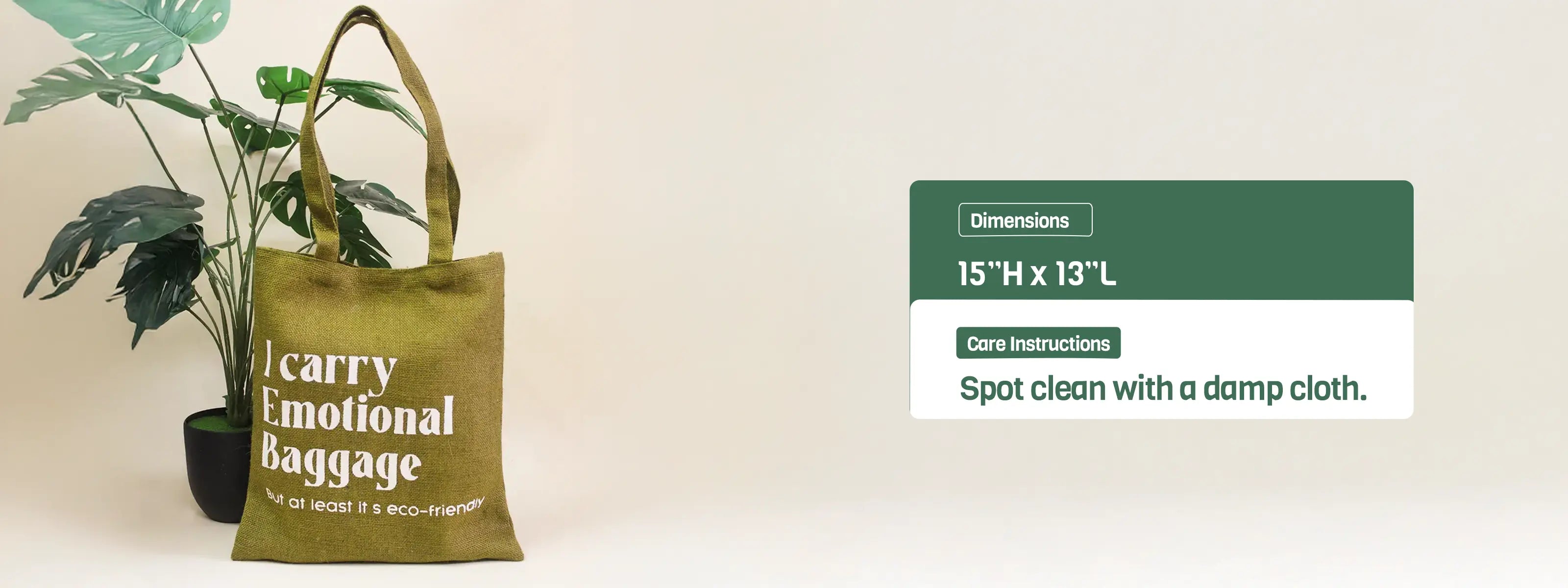 Jute tote with the quote "I carry Emotional Baggage, but at least it's Eco-friendly" quote to perfectly bring out sustainability in style to your everyday tote.(15"H x 13"W)