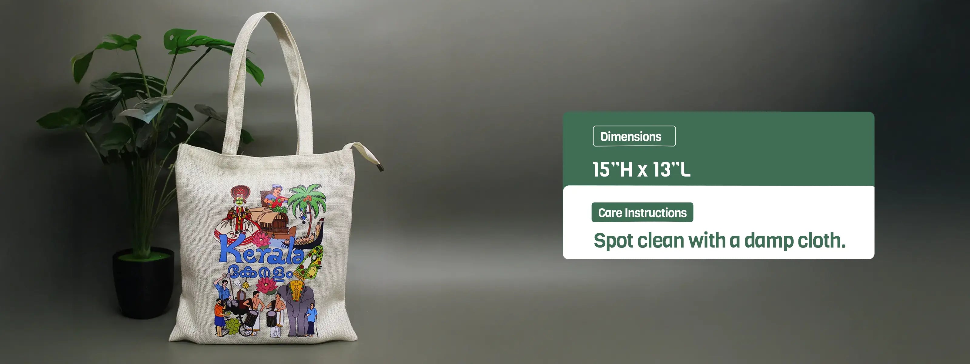 Jute tote which captures the essence of the state of Kerala to your everyday life with a zipper closure and an inner pocket.(15"H x 13"W)