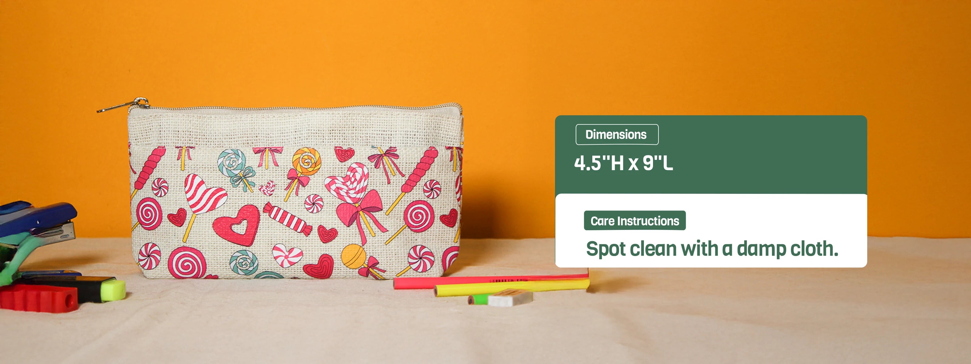 An eco-friendly jute pencil pouch(4.5"H x 9"W) with a lollipop print and a front pocket, perfect for kids to carry their everyday stationery in style.