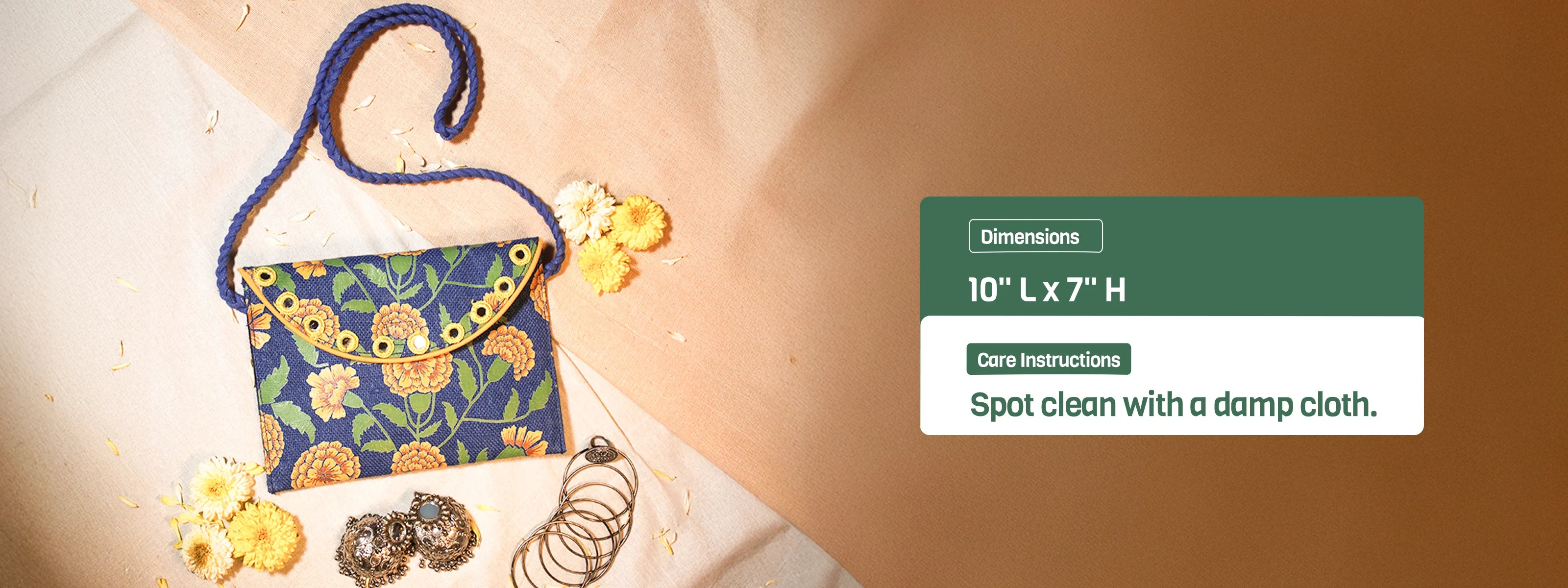 Our new sling bag with marigold all over print, has braided handles and is perfect for your festive times with beautiful mirror embellishment and piping detail.