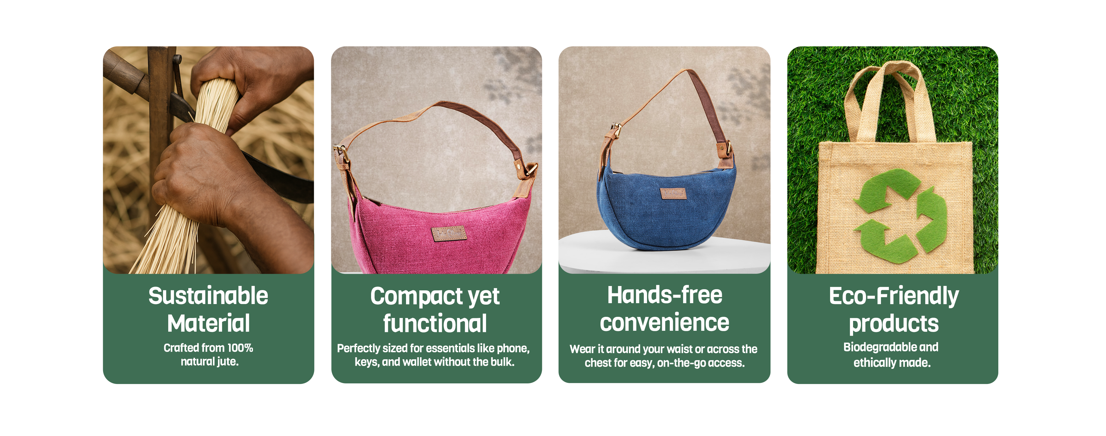 Eco-friendly, stylish, and proudly Made in India—Jute Cottage bags replace over 1000 plastic bags and support a greener planet. Our bags are Jute Mark Certified 100% Genuine Jute, 100% biodegradable and compostable and are durable, lightweight, and versatile.