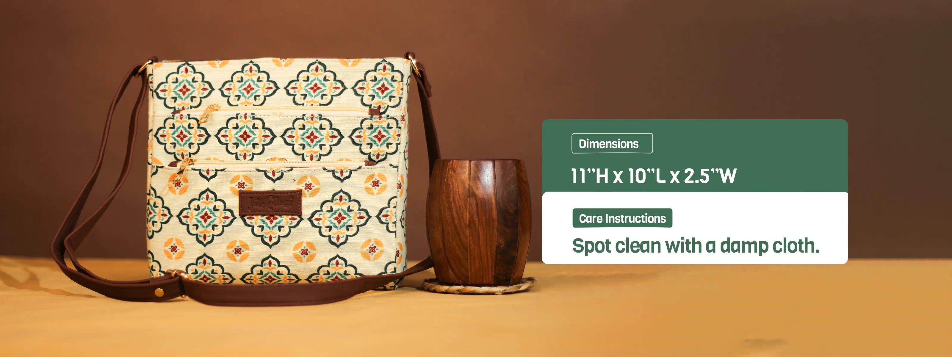 A spacious moroccan inspired sling bag made from JUCO(Jute cotton) fabric. Perfect for carrying essentials, this eco-friendly piece is the perfect blend of style and sustainability.(11"H x 10"L x 2.5"W)
