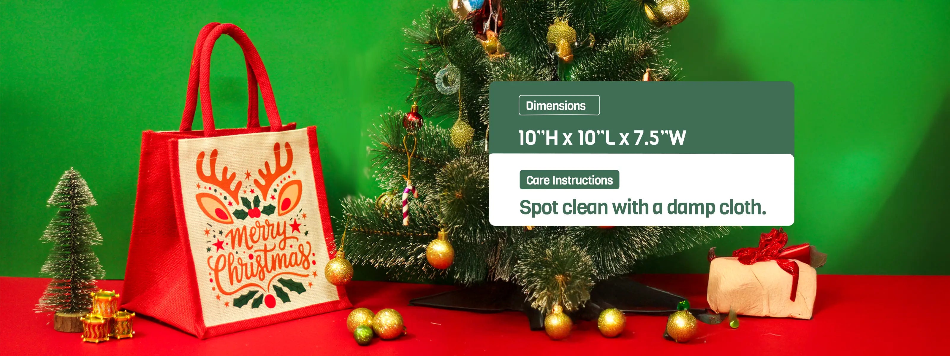 Eco-friendly, stylish, and festive, this jute gift bag(10"H x 10"L x 7.5"W) is your go-to for gifting, carrying essentials, and celebrating Christmas responsibly.