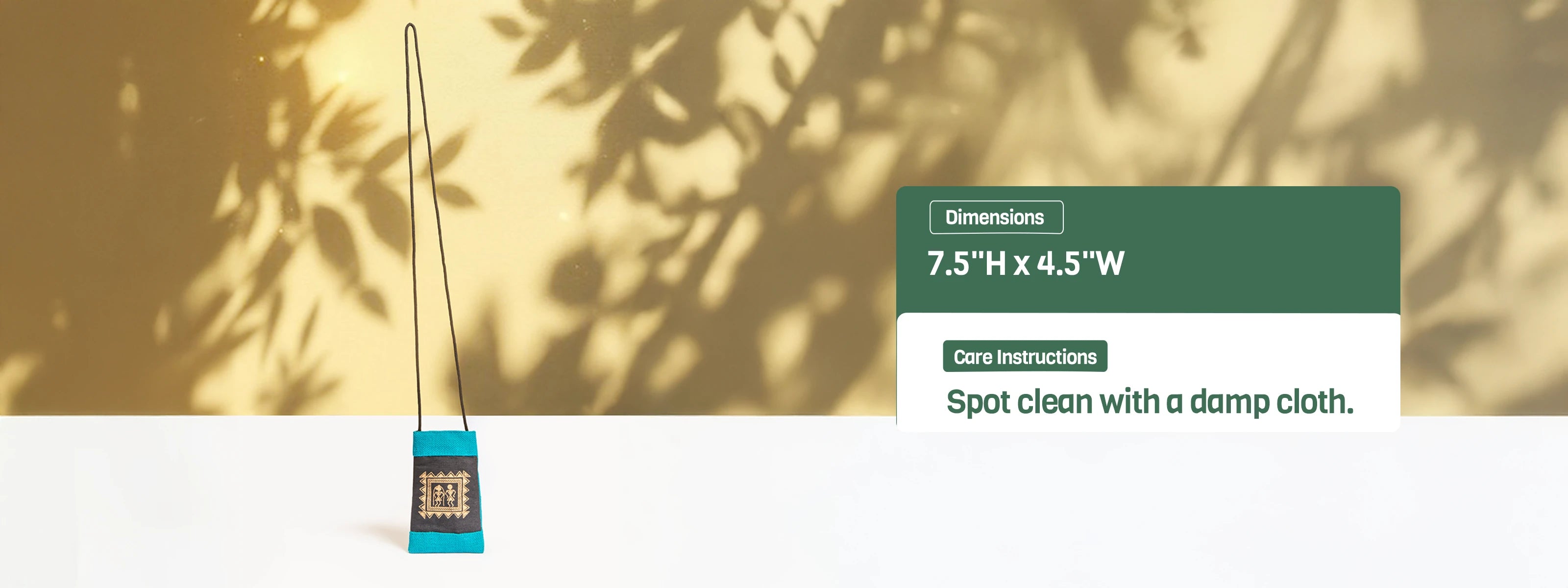 Compact eco-friendly jute mobile sling bag(7.5"H x 4.5"W) with Warli design and hook and loop fastener closure, perfect for carrying your phone of any size in style.