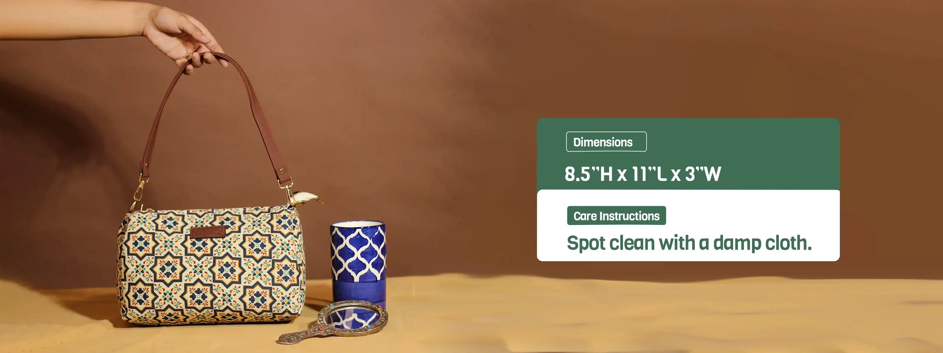A stylish everyday handbag made from JUCO(Jute-cotton) fabric, combining moroccan charm with a contemporary silhouette. Lightweight, durable, and perfect for conscious fashion lovers. (8.5"H x 11"L x 3"W)