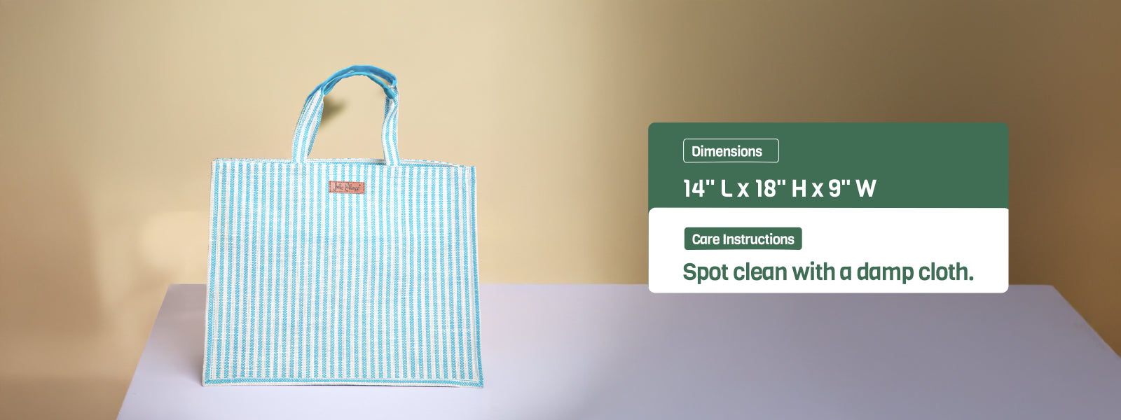 Carry your essentials in style with this eco-conscious jute bag, showcasing a timeless stripe design. Made from Jute Mark India Certified jute, it features a laminated interior for enhanced durability.(14"H x 18" L x 9"W)