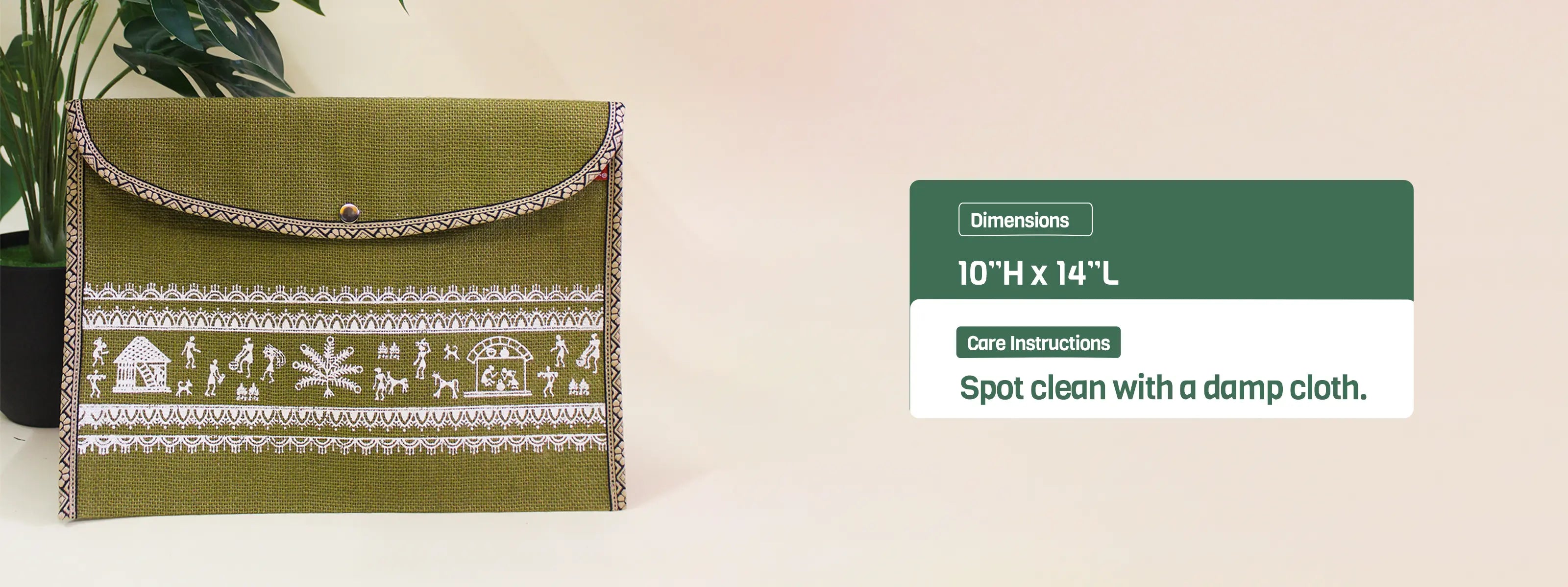 Crafted in jute and warli design, this 10”H x 14”L folder comes finished with an elegant button closure.