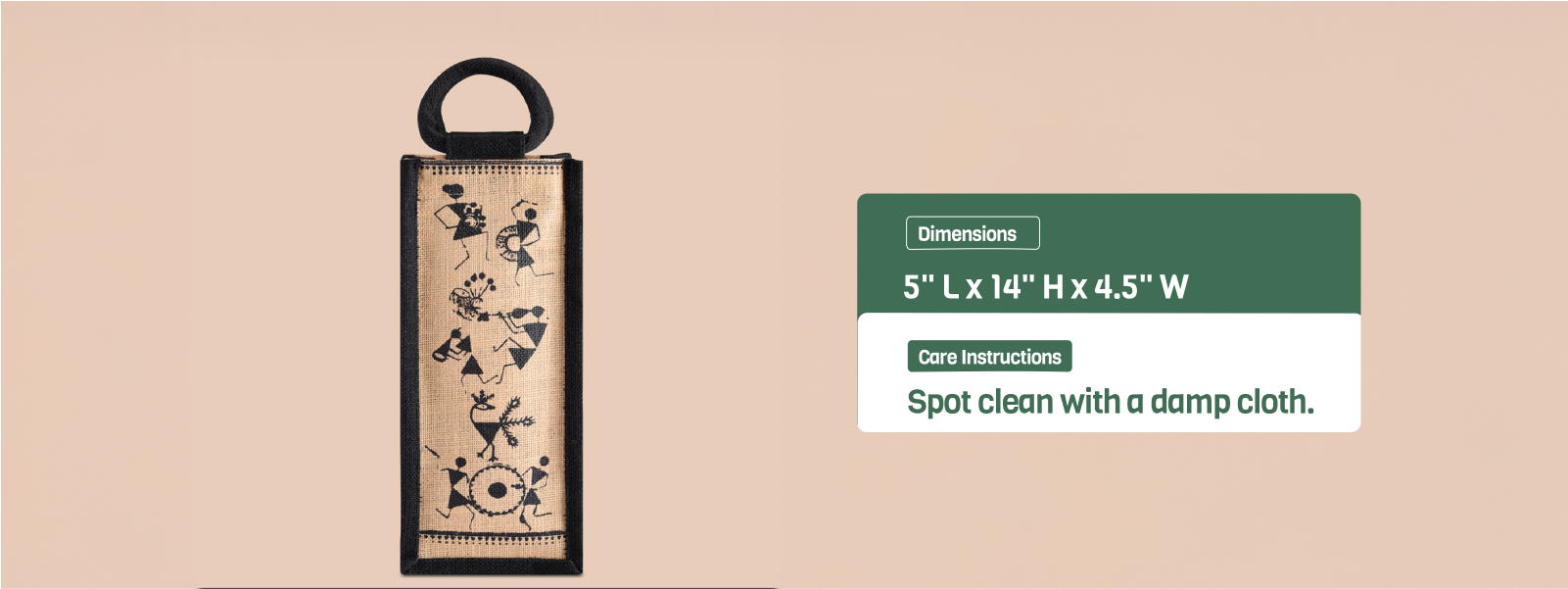 A jute bottle bag adorned with traditional Warli art. Eco-friendly and reusable, it’s perfect for gifting or carrying bottles with a touch of cultural charm.