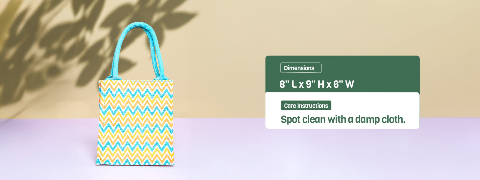 A vibrant jute lunch bag featuring bold multicolour zig-zag patterns. Eco-friendly, eye-catching, and perfect for carrying meals with a playful twist.