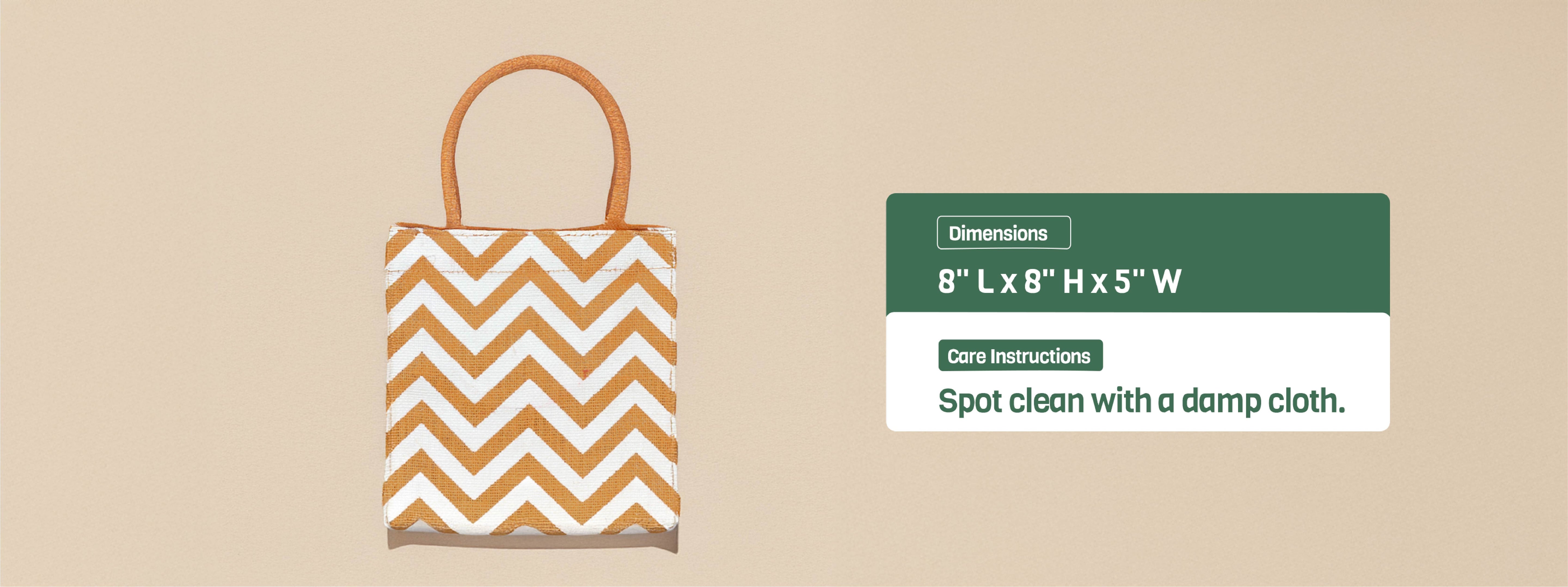 A vibrant jute lunch bag featuring a bold zig zag print. Lightweight, eco-friendly, and perfect for carrying your meals in style.